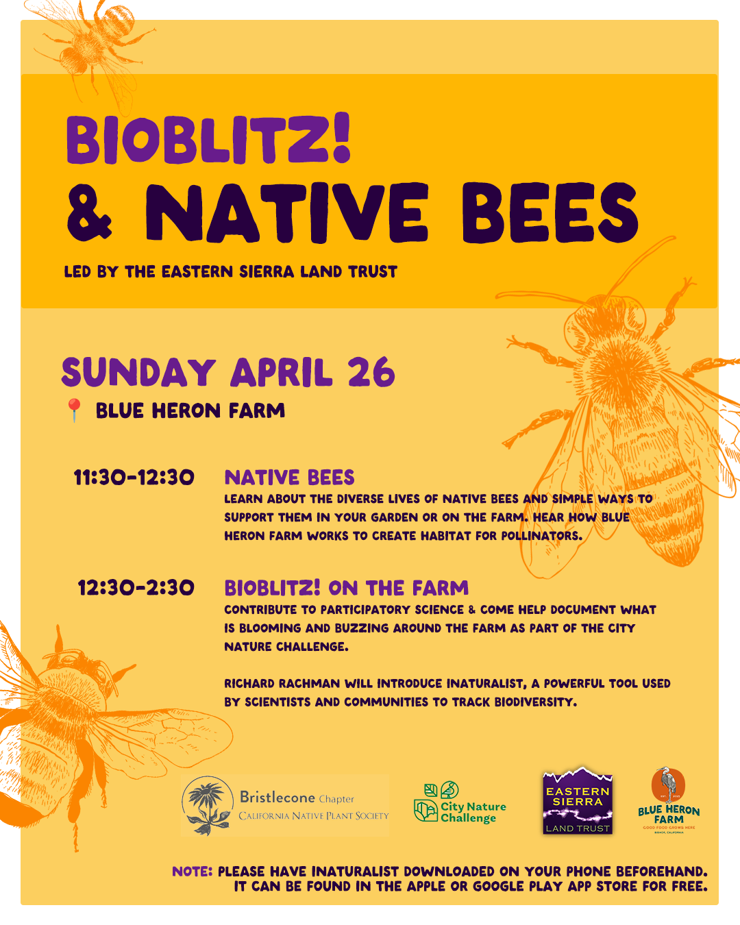 Eastern Sierra Land Trust Pollinator + Bioblitz Workshop Sunday, April 26, 2026 11:30 AM 2:30 PM Blue Heron Farm 475 Sierra Grande Street Bishop, CA, 93514 United States (map) Google Calendar ICS